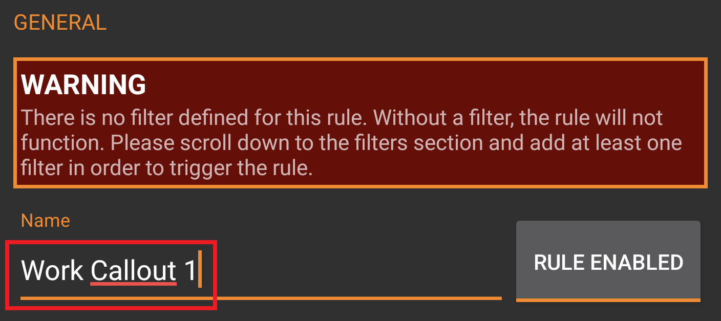 The rule requires a name in order to be identified. It does not need to be unique, but it should be descriptive as to what the rule will alert for. In this example, the rule name is set to “Work Callout 1”