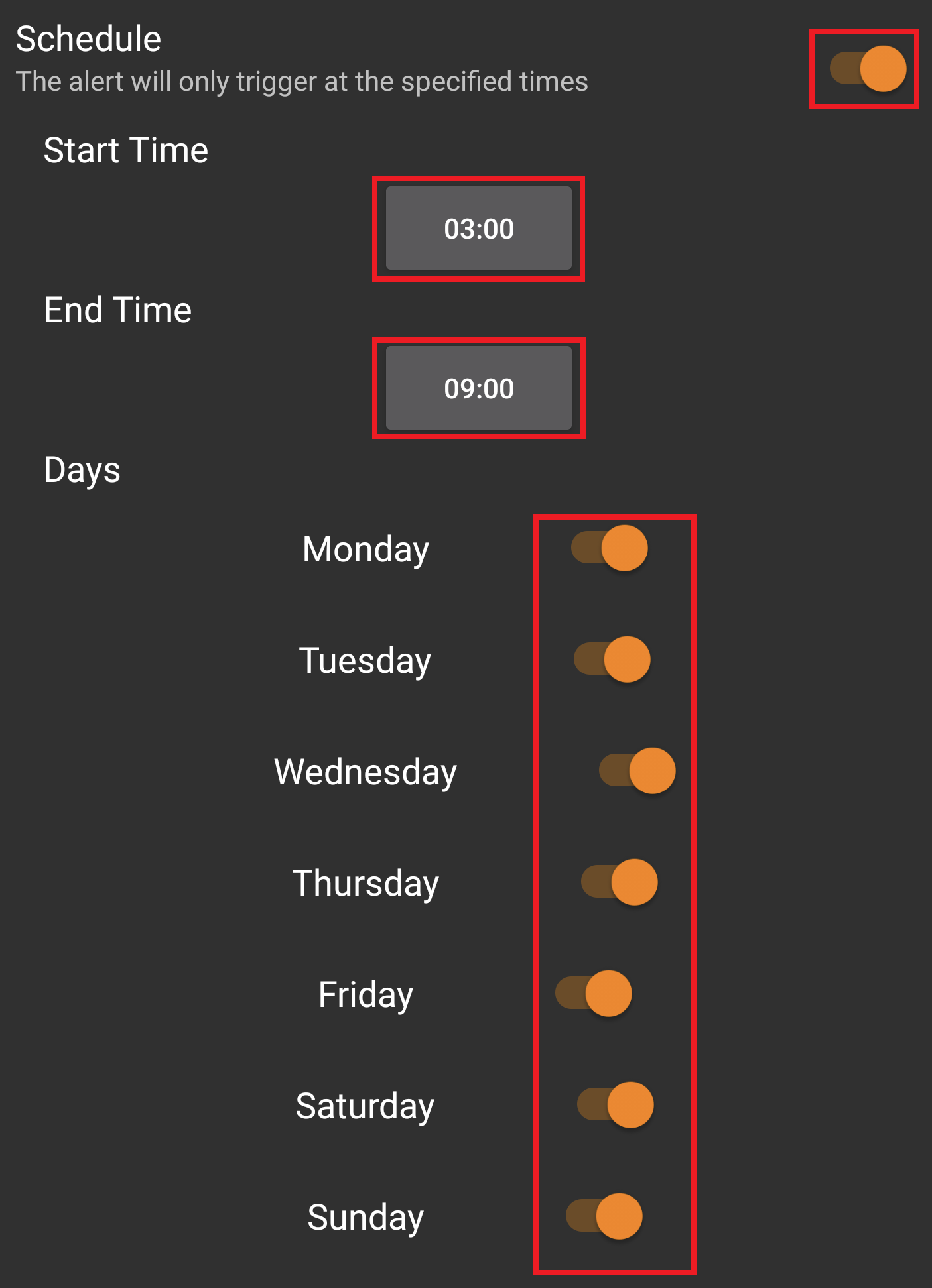 If you want to set a schedule for when the rule is active, turn on the toggle for this setting. When enabled you can set: