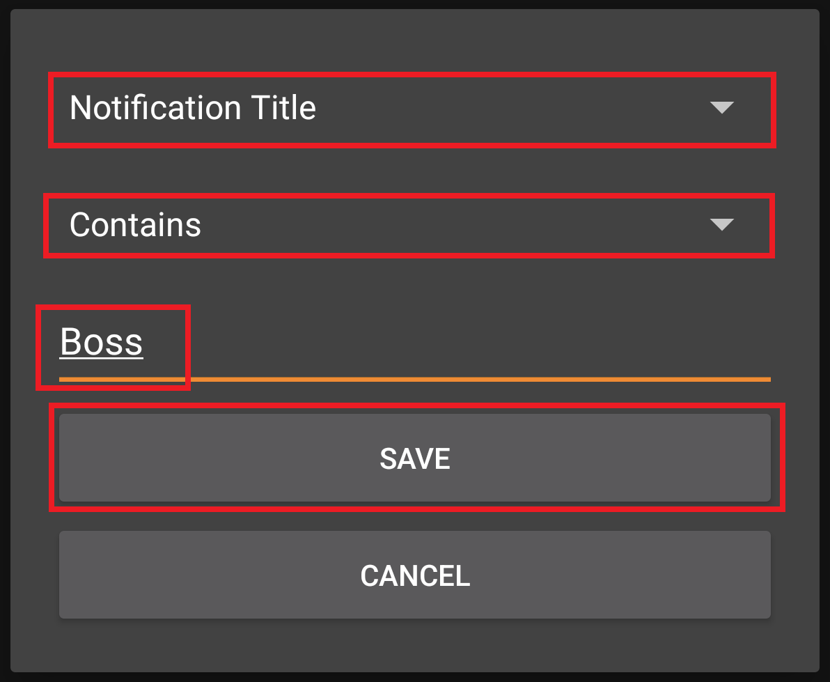 - Filter 1: Notification Title / Contains / Boss – tap “Save” to save the filter. An example of what a notification title looks like on your device is below. Usually this is the title of the notification, for email/SMS this is usually contact information: