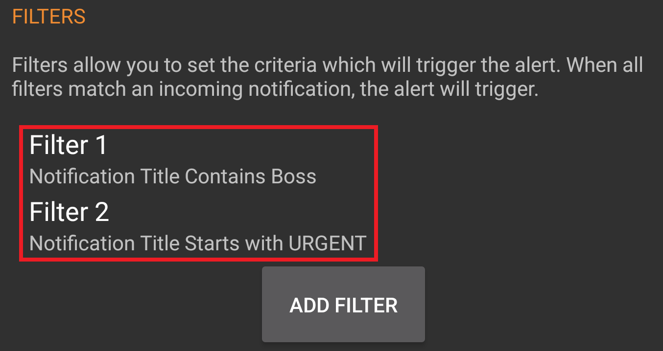 Filters use notifications provided by other apps on your device to trigger alerts. These notifications are shown in your notification shade (e.g. if you pull down from the top of the screen). For an example of what a notification looks like, see the screenshots towards the bottom of this section.