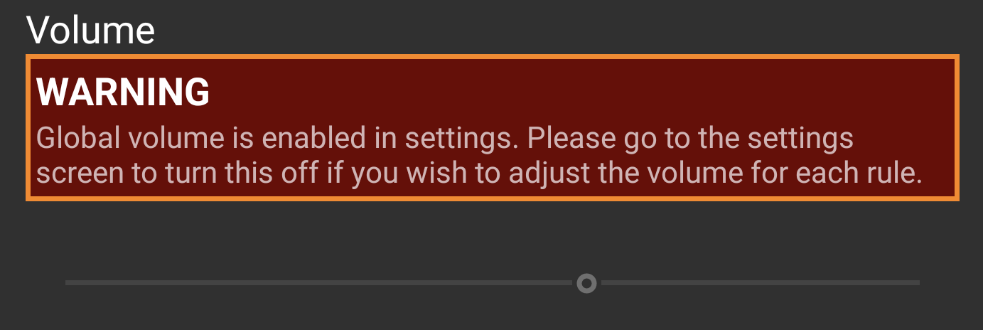 Please note: While this is enabled, if you edit a rule with “Play Audio” enabled, you will see a warning that the Global Volume is enabled in settings, and the volume slider will be disabled until Global Volume is disabled again: